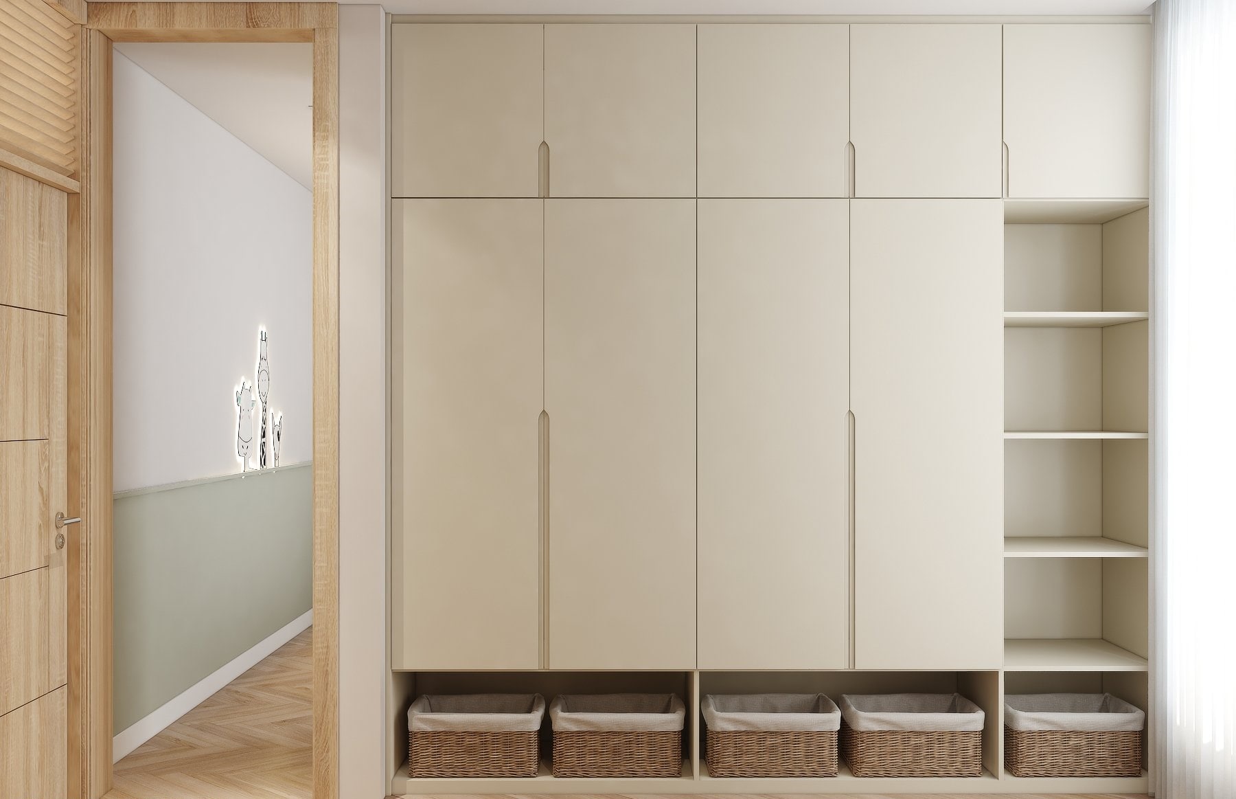Tủ cũng được chăm chút kĩ lưỡng, với tone màu đơn giản cũng làm không gian quá lòe loẹt.