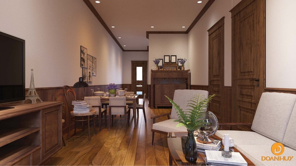Bàn ăn và ghế ăn cũng được sử dụng chất liệu gỗ tương tự tạo sự đồng nhất trong không gian phòng mang đến không gian sinh hoạt của cả gia đình thêm ấm cúng.
