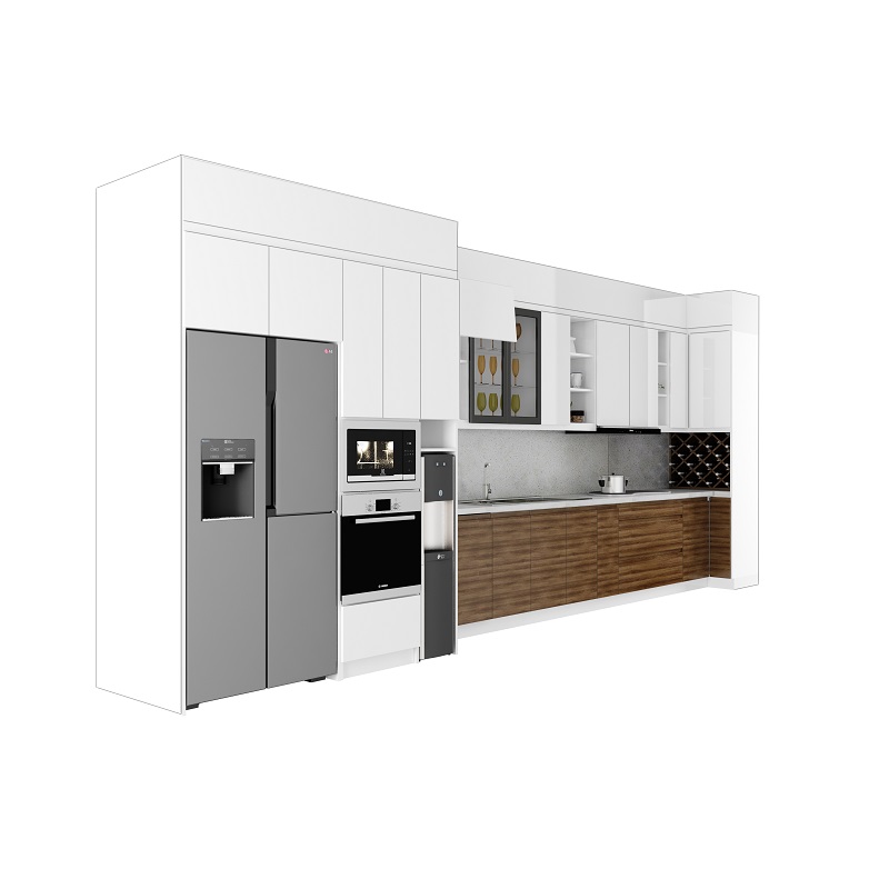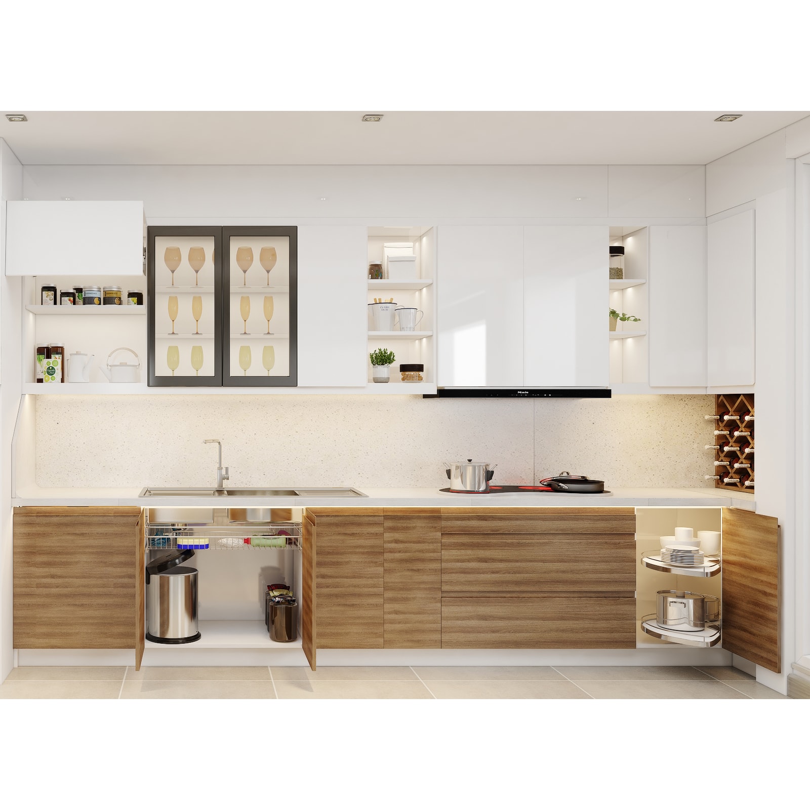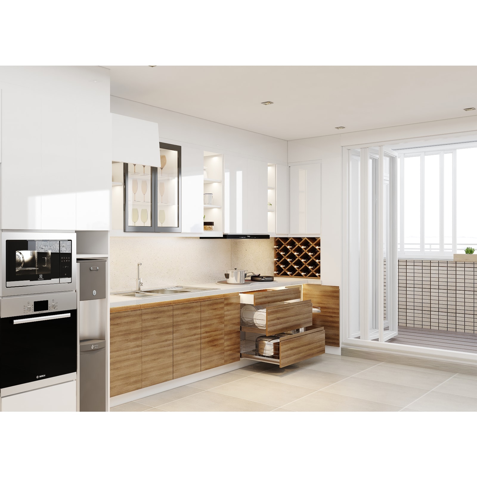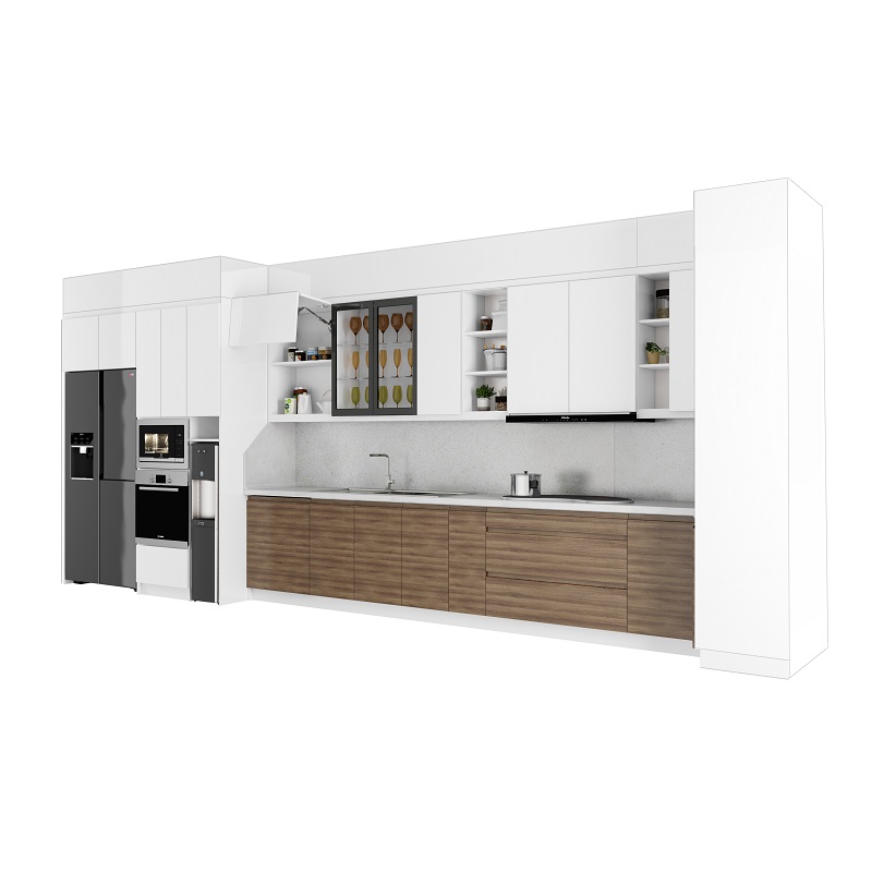 | Chất liệu (bao gồm dụng cụ đi kèm) | - Tủ bếp dưới HDF phủ laminate. - Tủ bếp trên HDF phủ acrylic. |