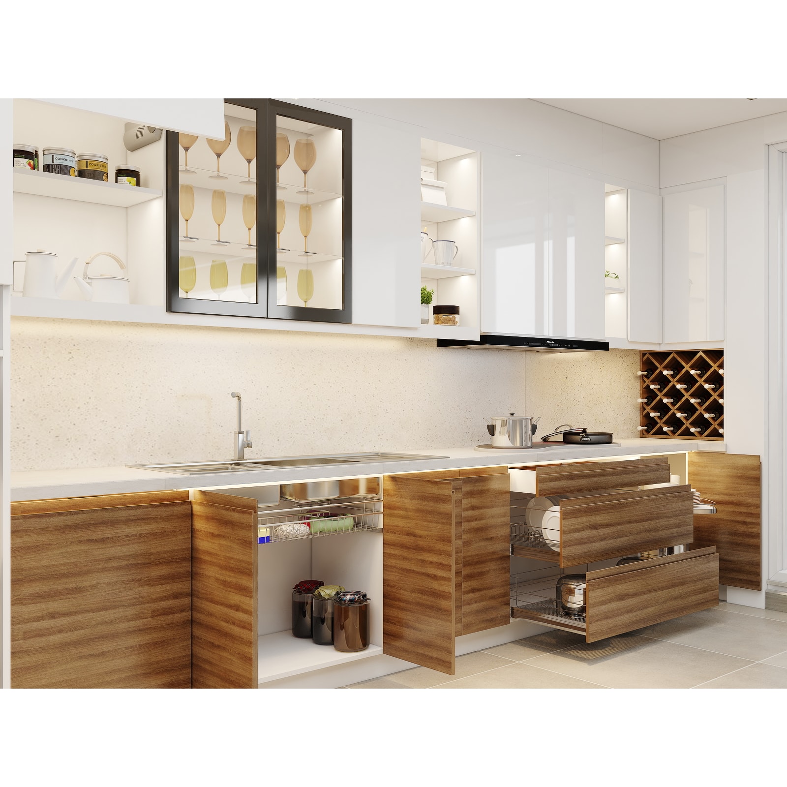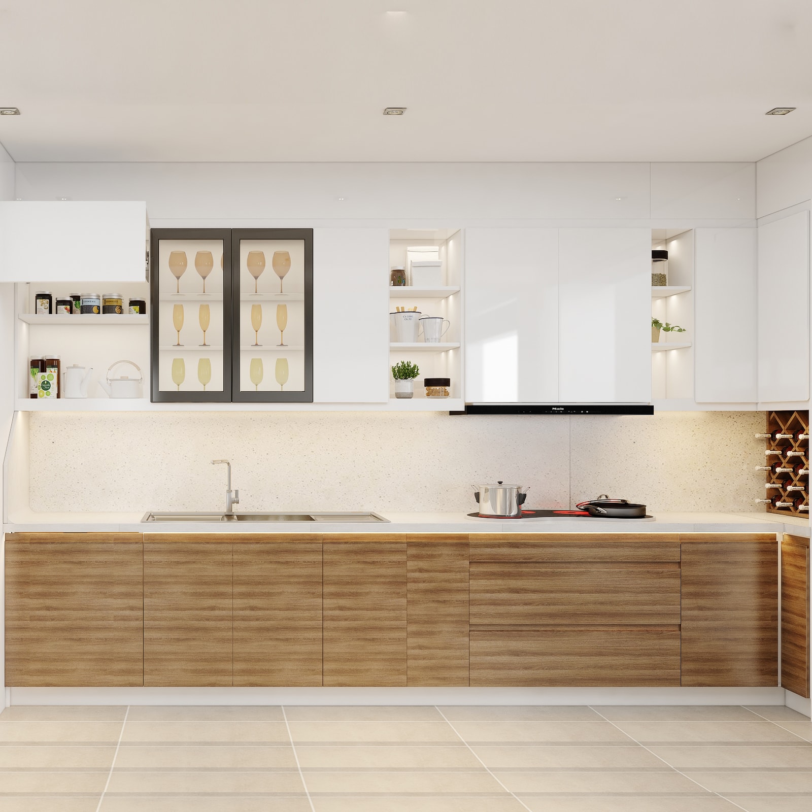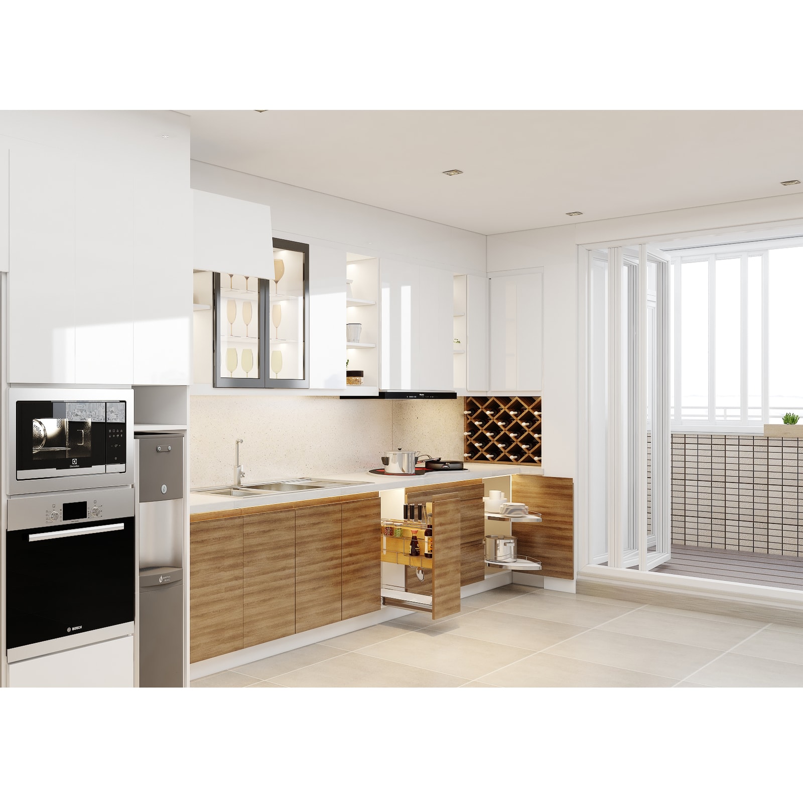 | Chất liệu (bao gồm dụng cụ đi kèm) | - Tủ bếp dưới HDF phủ laminate. - Tủ bếp trên HDF phủ acrylic. |