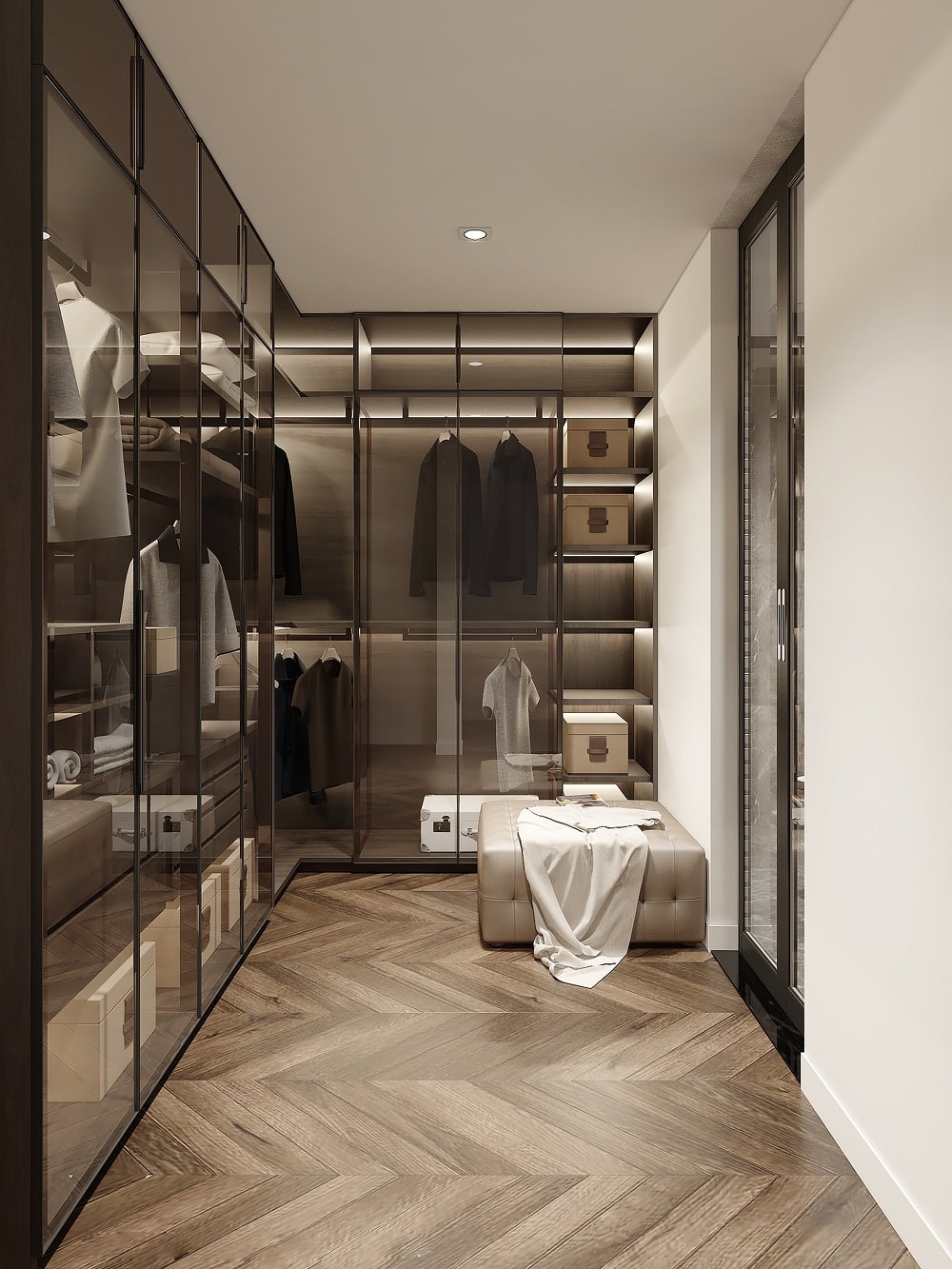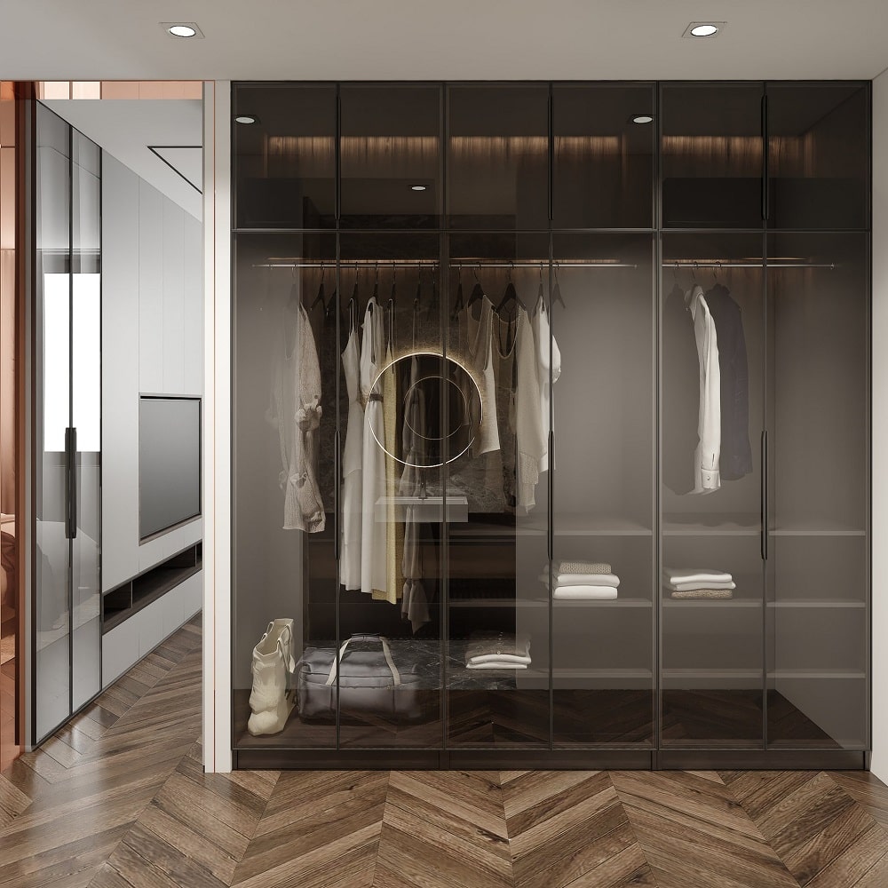 Khung kính sẽ bao bọc không gian chứa đồ bên trong những chiếc tủ, không chỉ giúp tạo khoảng mở, mà còn tăng độ sáng tối đa cho căn phòng.