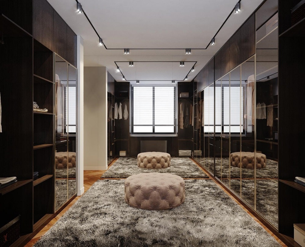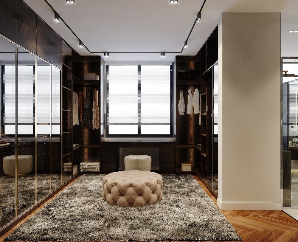 Mẫu phòng thay đồ này được thiết kế với tone màu sang trọng hơn với ghế ngồi và thảm giúp gia chủ có nhiều thời gian lựa chọn quần áo và giày dép hơn.