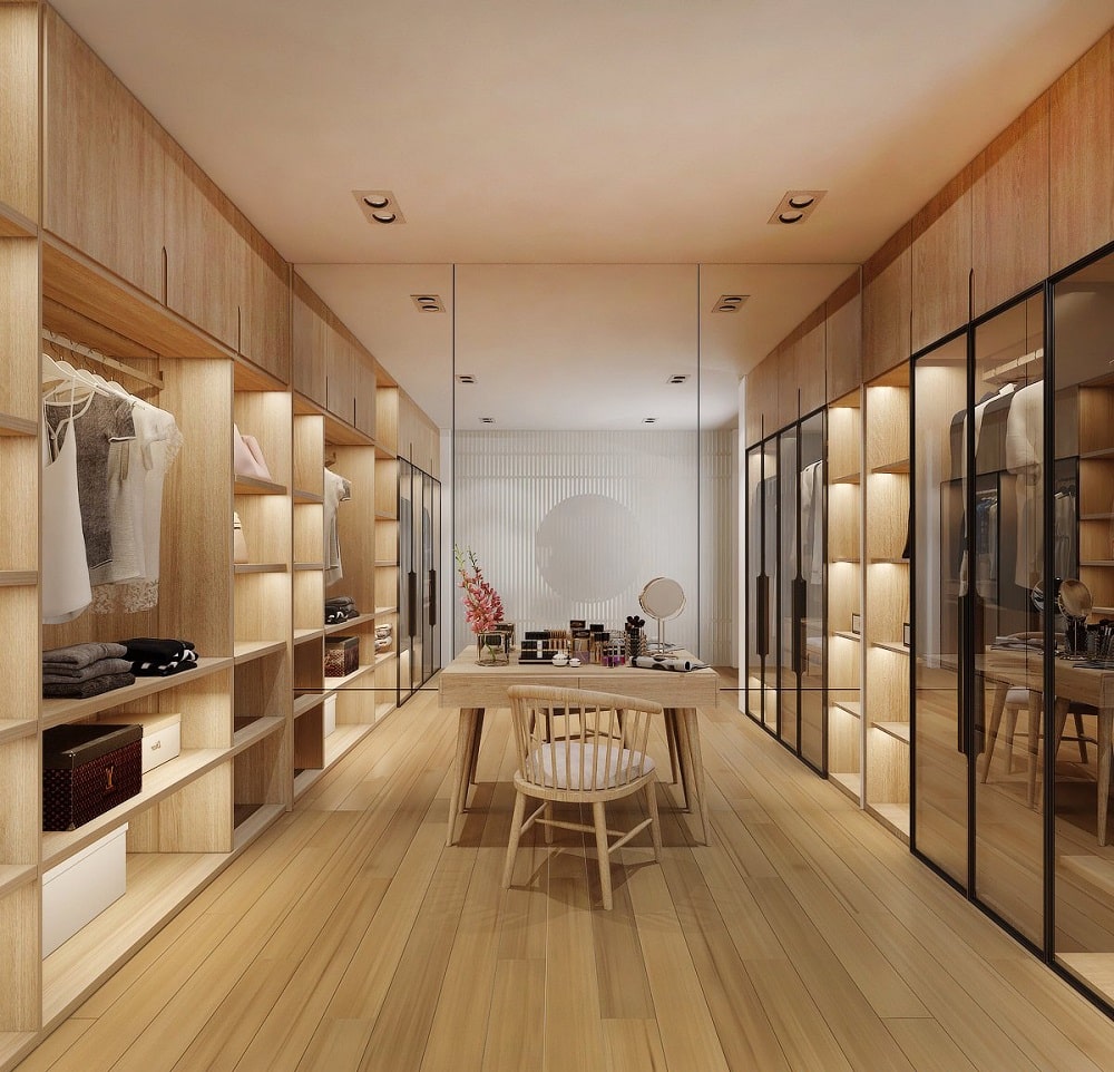 Mẫu phòng này áp dụng cho không gian phòng lớn phòng được thiết kế với tủ quần áo. Ngoài ra phòng còn được thiết kế với ghế ngồi và bàn trang điểm cũng tới tủ đựng đồ trang sực giúp cho gia chủ có thể sắp xếp được các mẫu đồ trang sức cũng như phụ kiện của mình gọn gàng và dễ lựa chọn hơn.